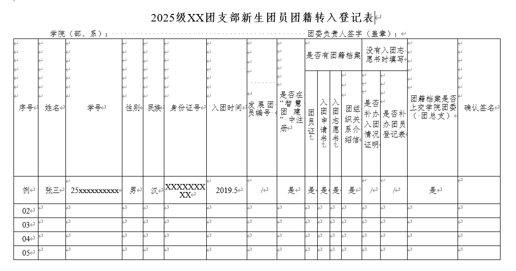 以团支部为单位汇总填写《2025级XX 团支部新生团员团籍转入登记表》,制作团员花名册。