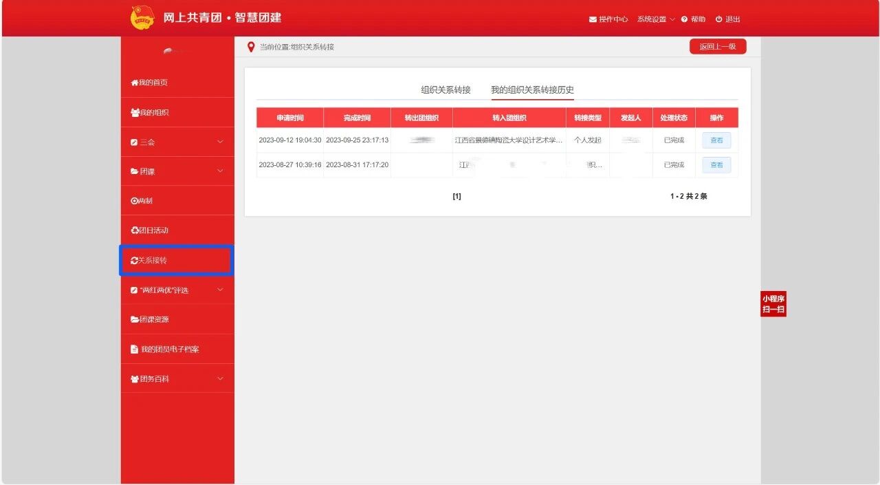 在申请完成后,可以在【我的组织关系转接历史】中查看发起的申请和处理状态。