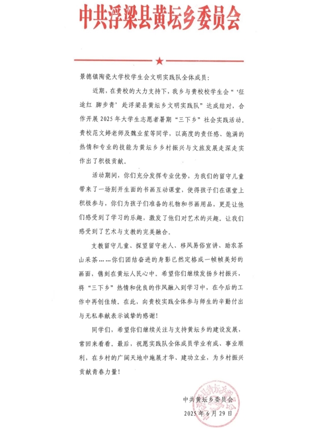 (图为黄坛乡政府为景德镇陶瓷大学学生会所写感谢信)