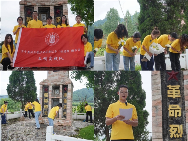 实践队抵达黄坛乡首日,在黄坛乡人民政府乡长张曹炜的带领下前往南溪村,瞻仰程先发革命烈士纪念碑。革命烈士纪念碑巍然矗立,两侧松柏青翠。全体学员庄严肃立,低头默哀三分钟,向为革命事业英勇献身的程先发烈士深深三鞠躬,并依次敬献鲜花。