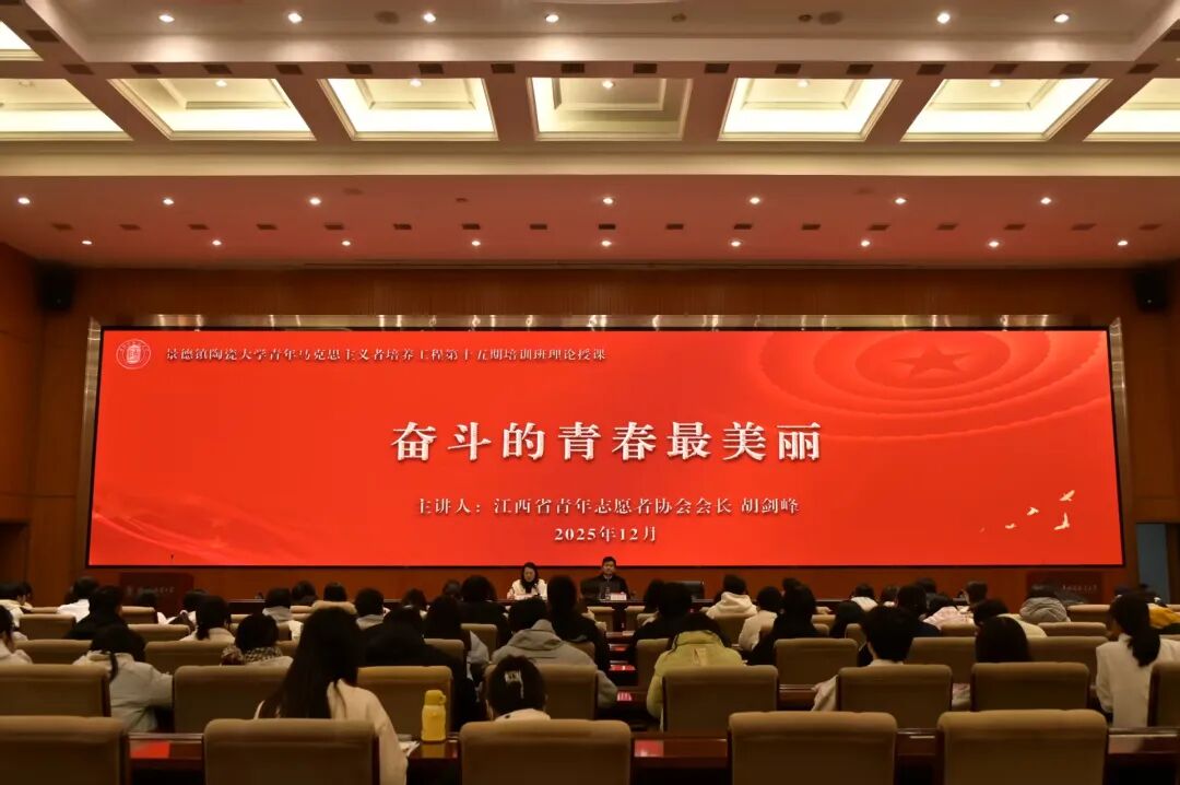 为深入学习贯彻习近平总书记致中国志愿服务联合会第三届会员代表大会的贺信精神,近日,我校在湘湖校区国际学术报告厅开展景德镇陶瓷大学青年马克思主义者培养工程第十五期培训班理论授课。本次活动邀请中国青年志愿者协会常务理事、江西省青年志愿者协会会长、江西省志愿服务联合会副会长胡剑峰以“奋斗的青春最美丽”为题进行专题授课。全体专(兼)职团干部、校第十五期“青马班”学员、志愿服务社团学生干部、各学院(部、系)学生代表200余人参加。