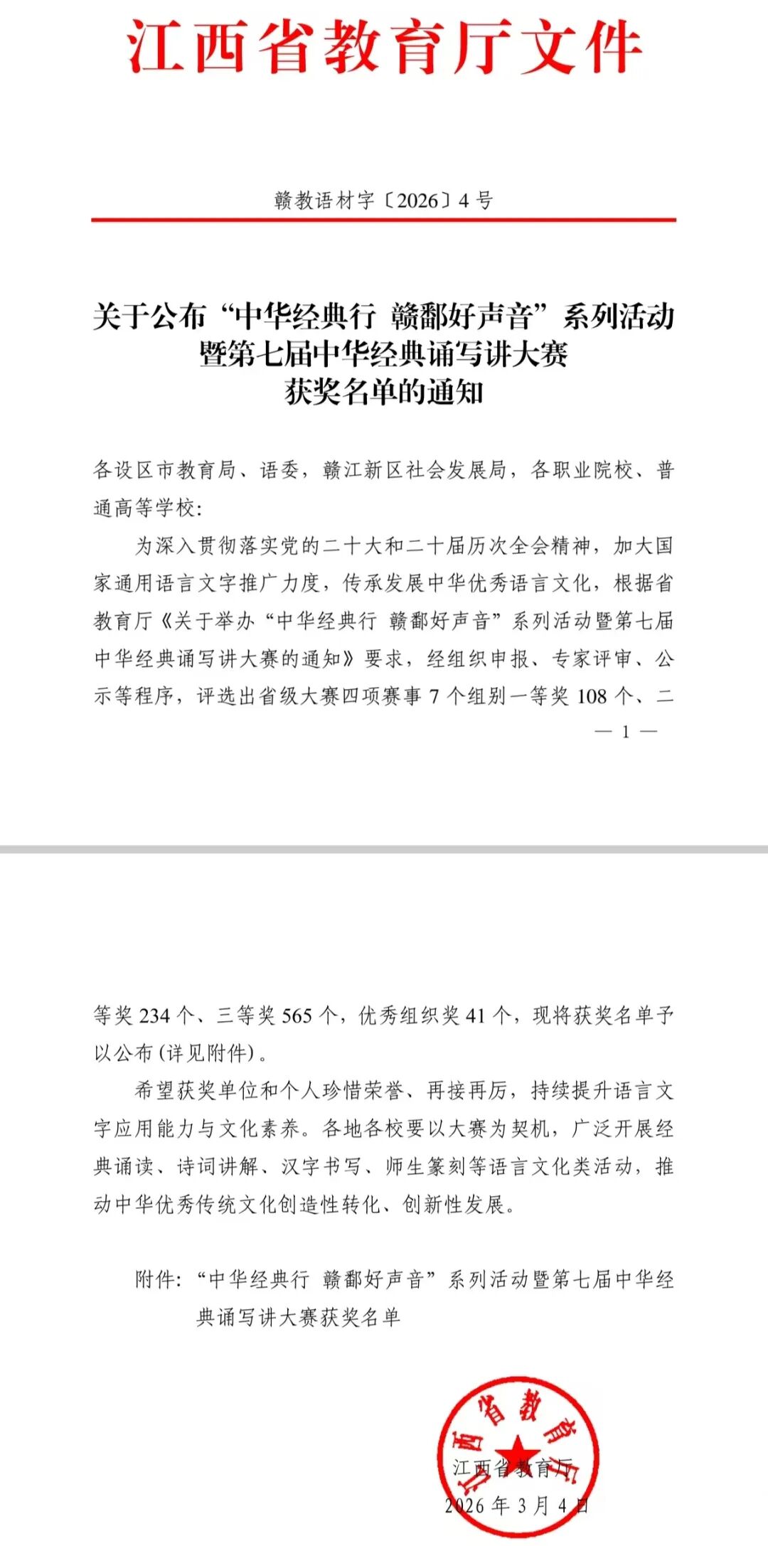 近日,江西省教育厅发布“中华经典行 赣鄱好声音”系列活动暨第七届中华经典诵写讲大赛评选结果。我校师生荣获优秀组织奖,并在省级大赛四项赛事7个组别中获一等奖1项、二等奖7项、三等奖11项,充分展现了学校在传承发展中华优秀语言文化方面的扎实成效和昂扬风貌。